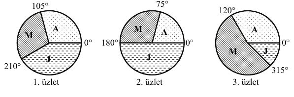 Egy könyvkiadó minden negyedévben összesíti, hogy három üzletében melyik szépirodalmi kiadványából fogyott a legtöbb. A legutóbbi összesítéskor mindhárom üzletben ugyanaz a három szerző volt a legnépszerűbb: Arany János, Márai Sándor és József Attila. Az alábbi kördiagramok szemléltetik, hogy az üzletekben milyen arányban adták el ezeknek a szerzőknek a műveit. A kördiagramok az első üzletből 408, a másodikból 432, a harmadikból 216 eladott könyv eloszlásait szemléltetik.